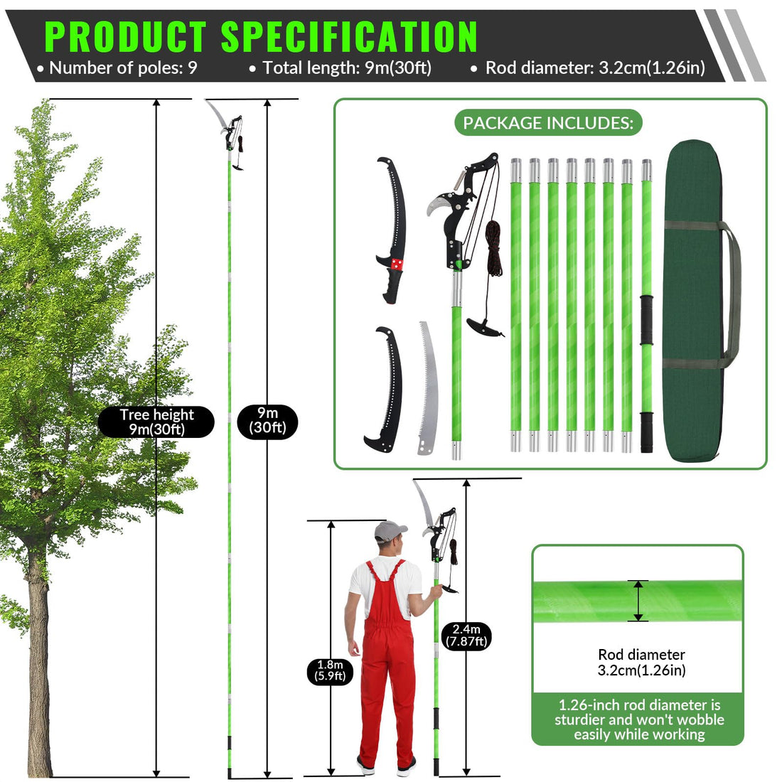Brand: VELPAXColor: GreenFeatures: 【Lightweight and Sturdy】- The pole saw long reach consists of 9 epoxy...
