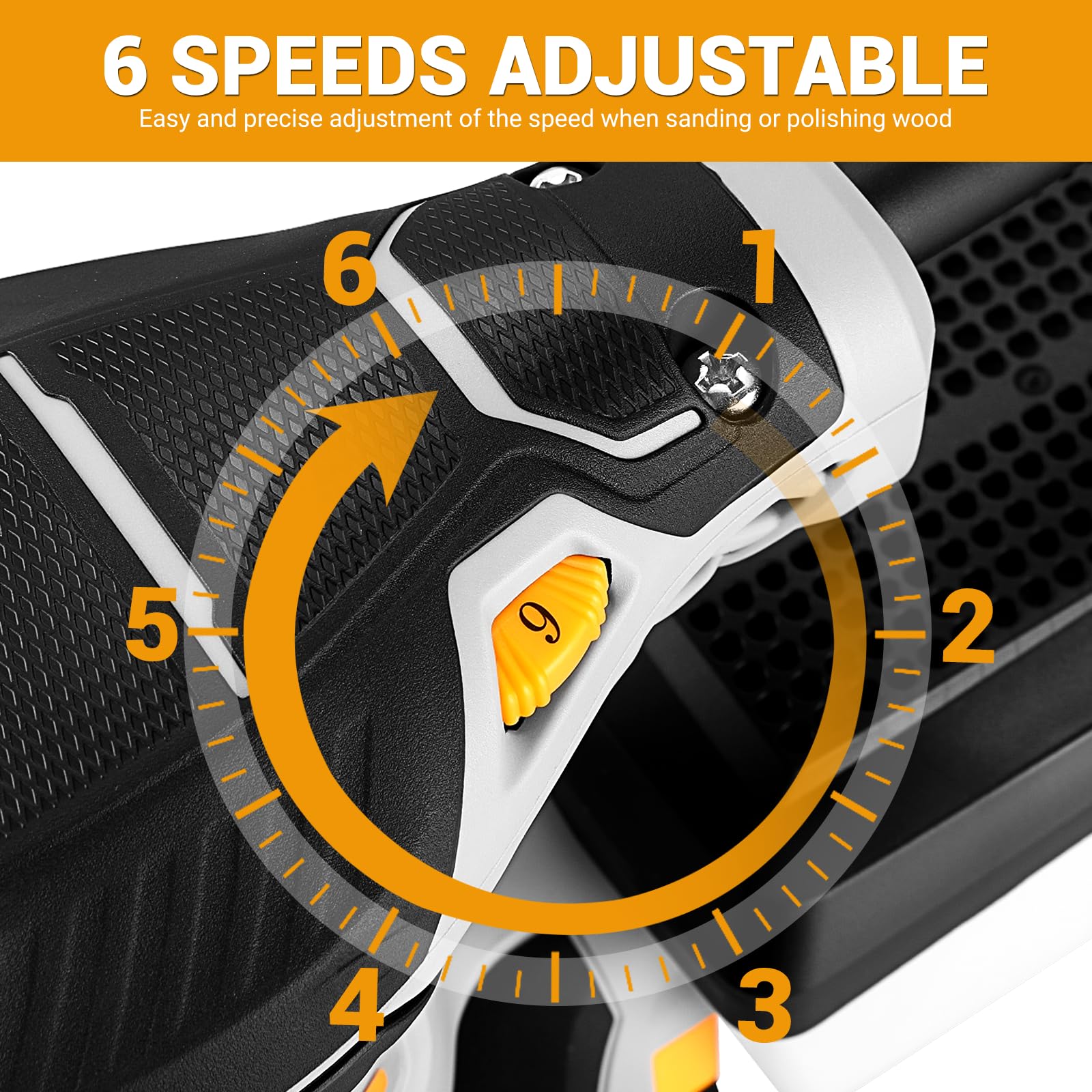 - 【Powerful Operating System & 6 Various Speed】Our random orbit sander has 6 various speed,the speed dial allows you to increase or decrease the speed from 7,000-14,000 orbits per minute to different applications and materials.More comfortable rubber grip design, which can reduce hand fatigue. Low vibration and noise can help you concentrate on your work.