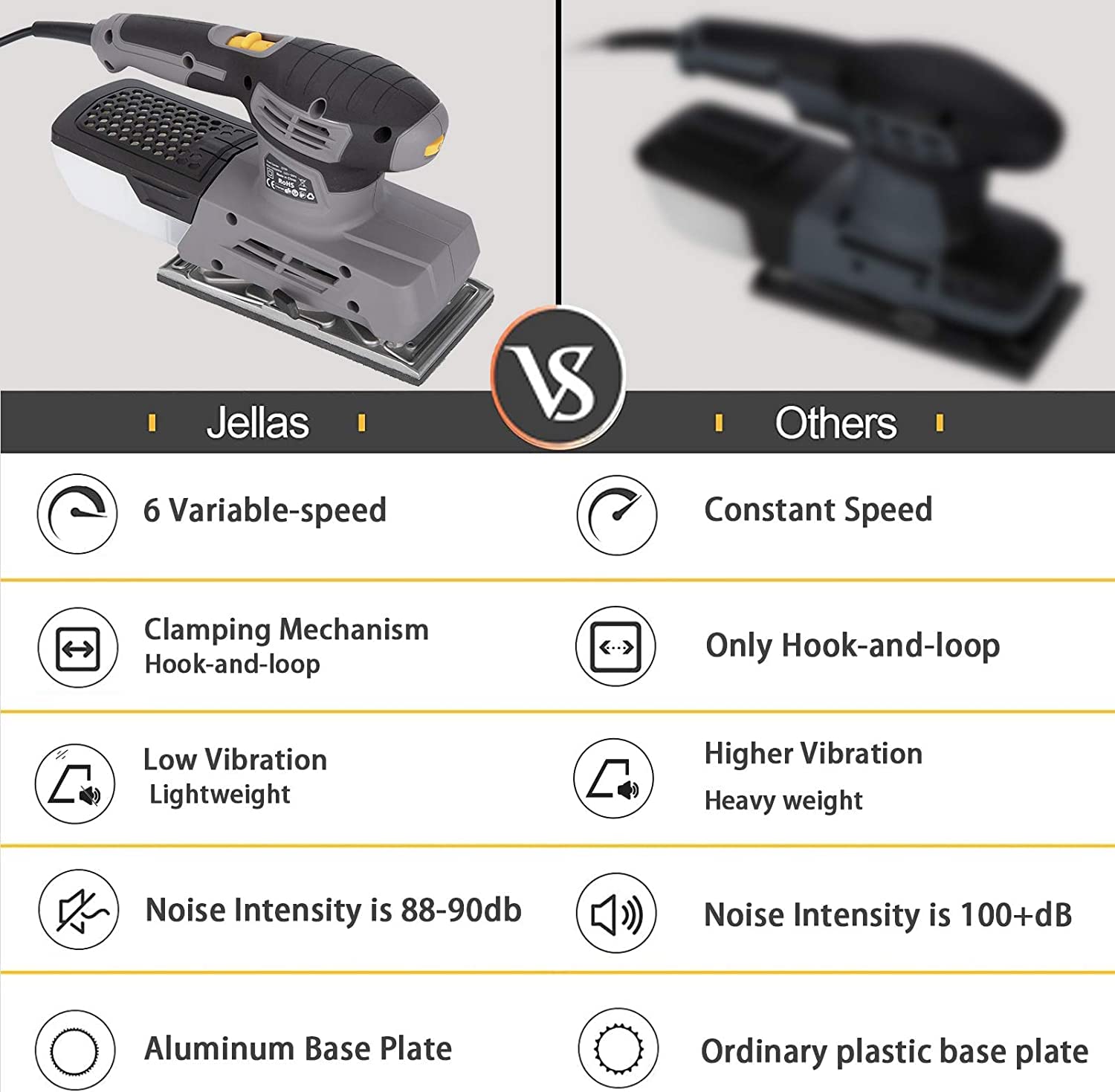 - 【Aluminum Base Plate】JELLAS electric sanders adopt a superior solid aluminum sanding plate design, features high durability and more even sanding; 2mm oscillation travel increase efficiency finishing sanding; Ideal for sanding tabletops, floor, doors, cabinets, skirting boards, etc